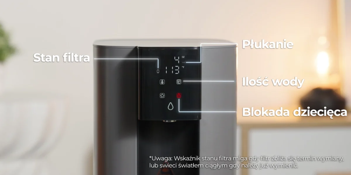 Panel dotykowy prezentuje temperaturę, objętość oraz stan filtrów, umożliwiając bieżącą kontrolę ustawień i przewidywalną eksploatację urządzenia.