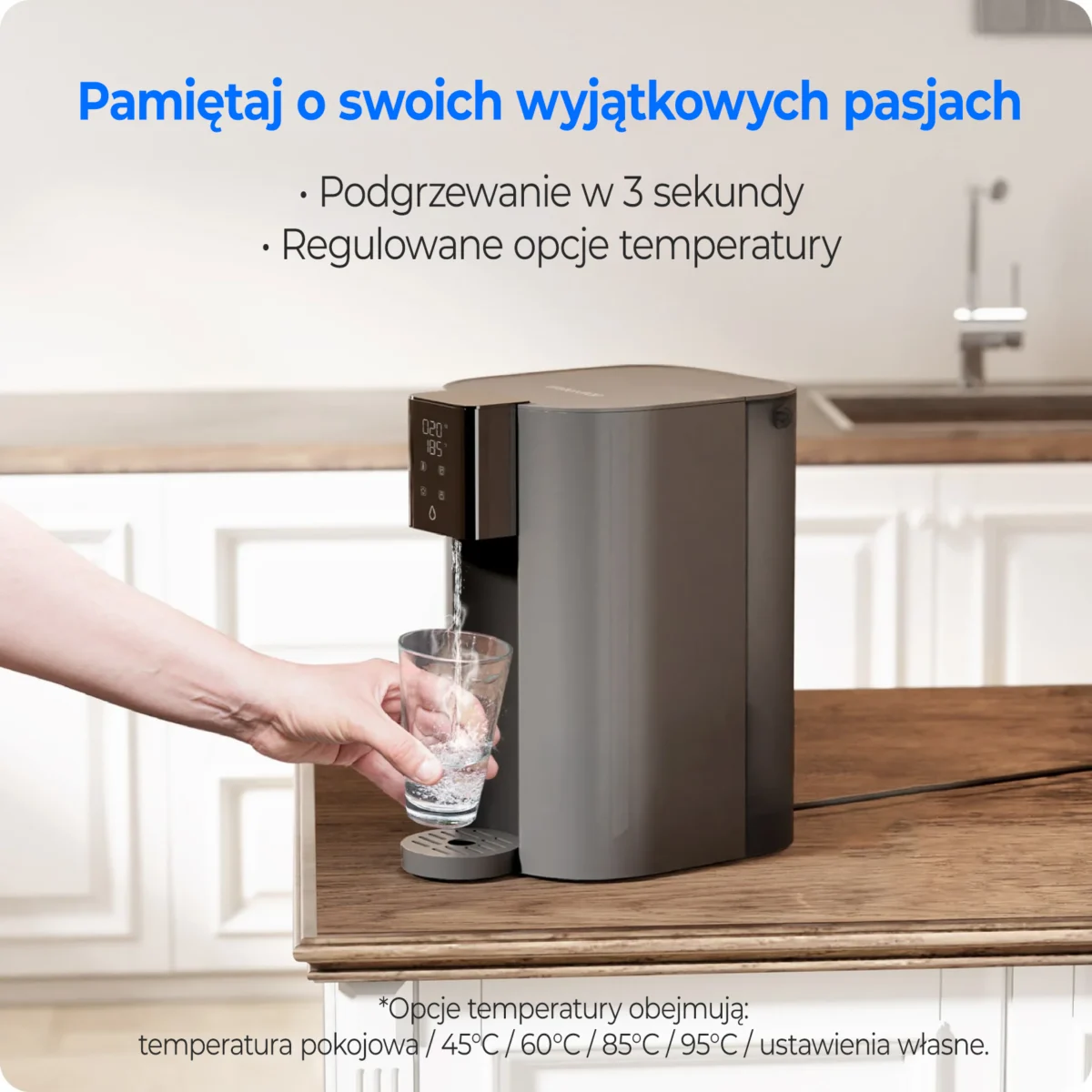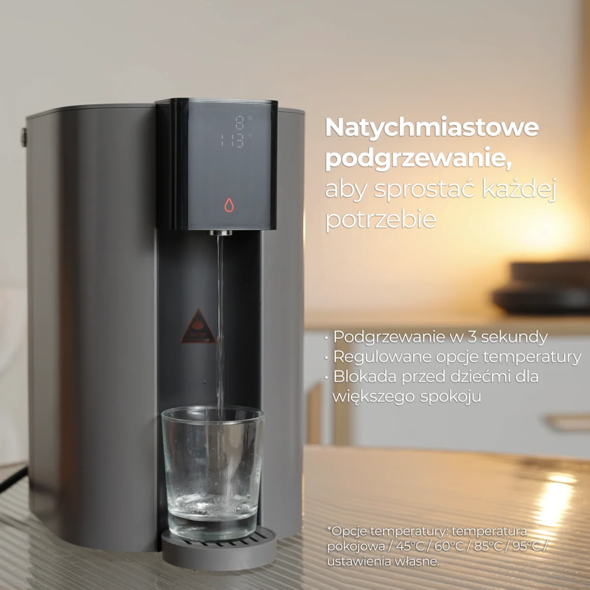 Wystarczy zaledwie 3 sekundy, aby uzyskać natychmiastową gorącą wodę do zaparzenia kojącej herbaty, orzeźwiającej kawy i innych napojów. Dzięki regulowanym ustawieniom temperatury i objętości, ten blatowy system odwróconej osmozy z natychmiastowym podgrzewaniem jest idealny na każdą okazję.