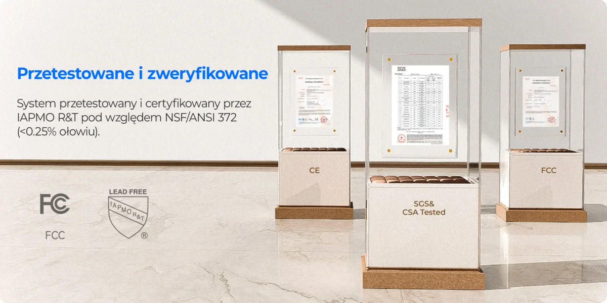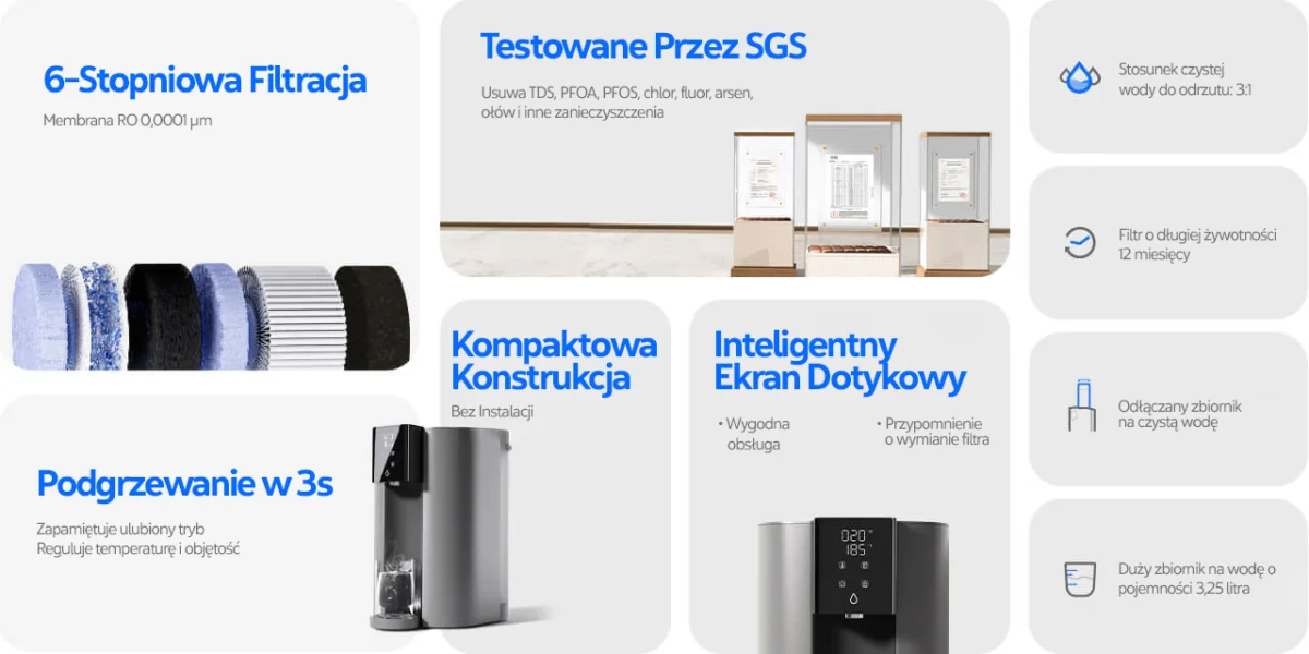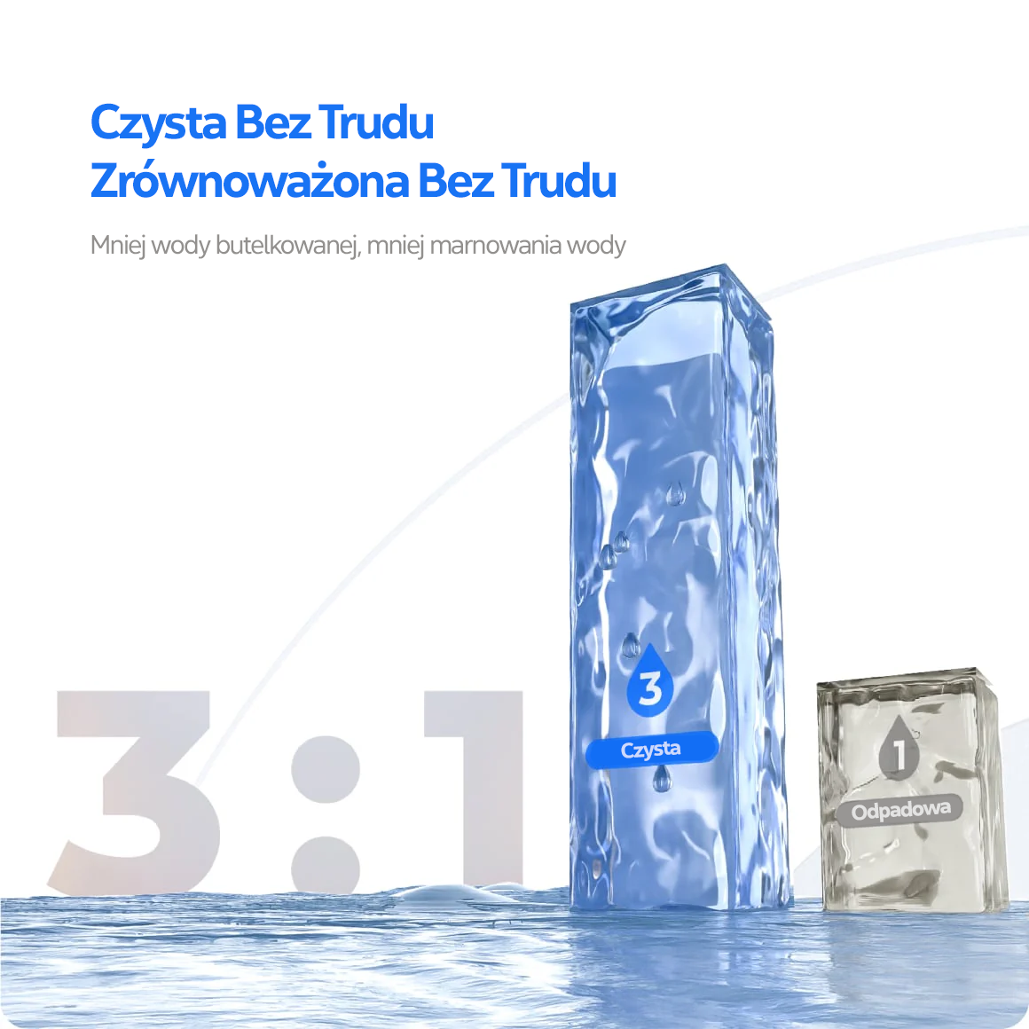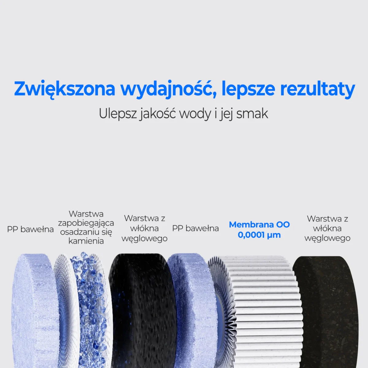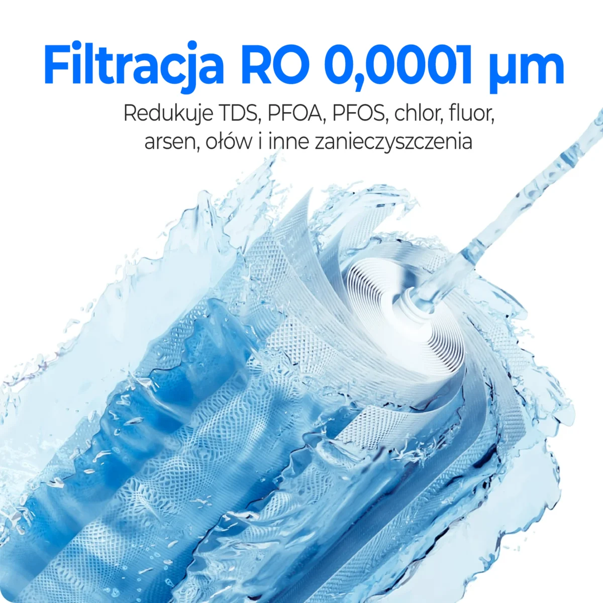 6-stopniowy system z membraną o dokładności 0,0001 μm redukuje całkowitą ilość rozpuszczonych substancji stałych (TDS) oraz wybrane zanieczyszczenia chemiczne, w tym metale ciężkie i chlor. Proces odbywa się przepływowo — bez zbiornika ciśnieniowego i bez modyfikowania instalacji kuchennej, zapewniając stały dostęp do oczyszczonej wody.