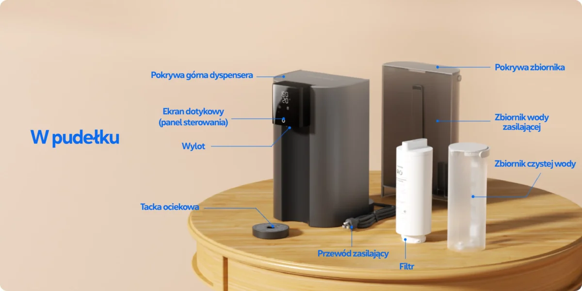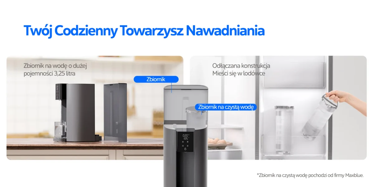 Wyjmowany zbiornik ułatwia nalewanie do naczyń, przechowywanie w lodówce oraz korzystanie z wody poza urządzeniem.