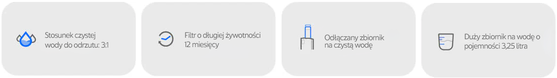 Zbiornik 3,2 l umożliwia pobór kilku porcji bez dolewania. Wydajność do 284 l/d pozwala napełnić szklankę 250 ml w ok. 76 s. Stosunek 3:1 ogranicza ilość wody odpadowej w porównaniu z klasycznymi rozwiązaniami filtracyjnymi.