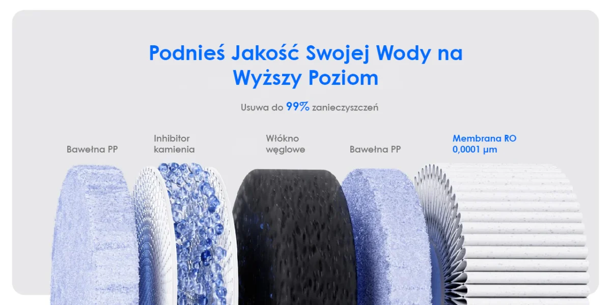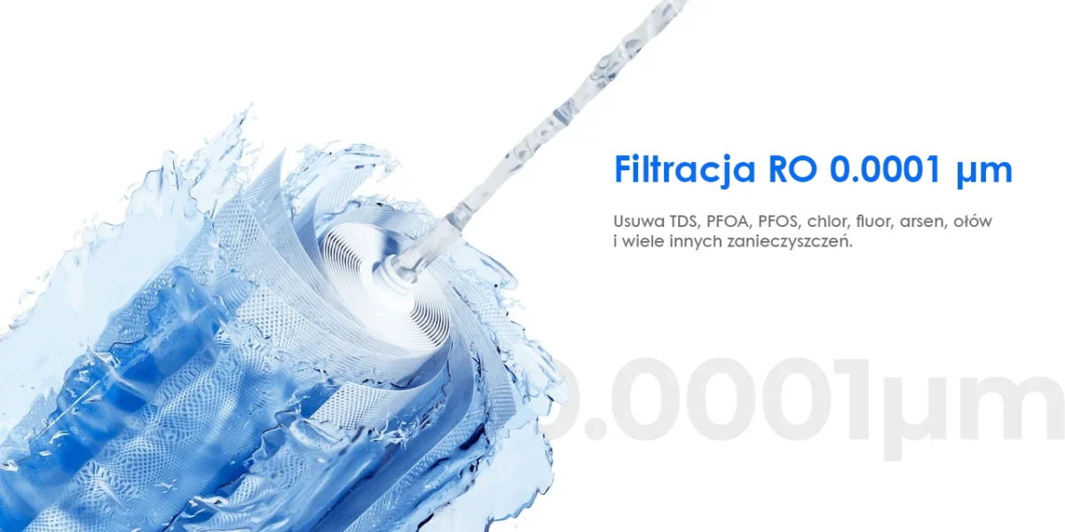 Membrana RO stanowi główny element oczyszczający wodę. Działa jako półprzepuszczalna bariera redukując rozpuszczone substancje stałe (TDS), wybrane metale ciężkie i drobne zanieczyszczenia chemiczne obecne w wodzie kranowej, co przekłada się na wyższą przejrzystość i stabilne parametry jakościowe wody pitnej.
