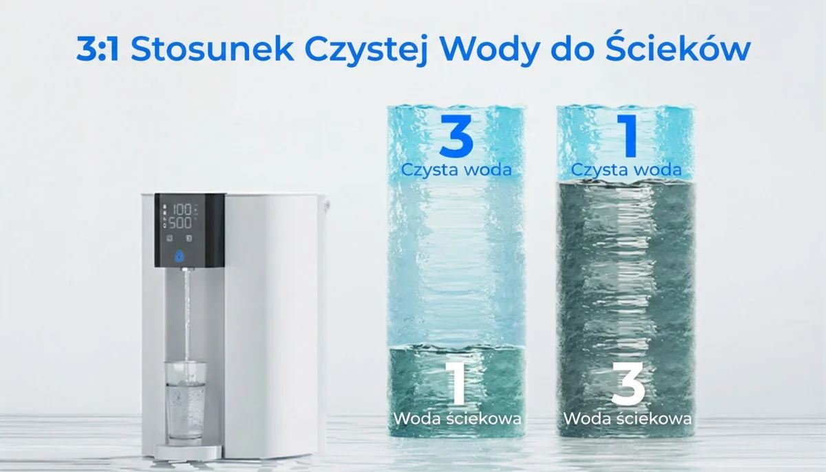 Stosunek wody czystej do odpadowej wynosi 3:1, co ogranicza ilość wody odpadowej w porównaniu z wieloma klasycznymi systemami RO.