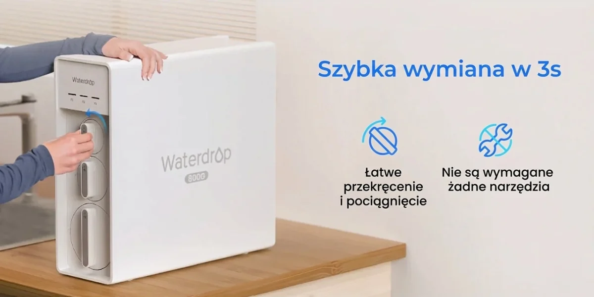 2 999,00 złByło 3 399,00 złOszczędź 400,00 złWaterdrop X8 to bezzbiornikowy filtr wody z odwróconą osmozą (RO) do montażu pod zlewem. Oczyszcza wodę w chwili poboru i podaje ją bezpośrednio z instalacji domowej, zapewniając stały dostęp do filtrowanej wody — bez magazynowania i bez spadków wydajności.