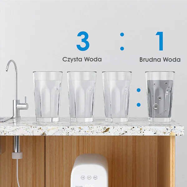 Dzięki większej powierzchni membrany, filtr produkuje 3 szklanki czystej wody na każdą 1 szklankę ścieku. Oszczędza więcej wody w porównaniu z tradycyjnymi systemami RO.