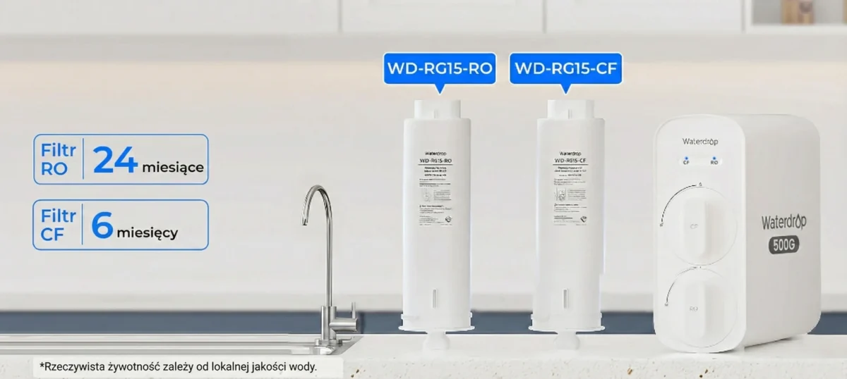 | Żywotność filtra | G5P500-CF – 6 miesięcy, G5P500-RO – 24 miesiące |