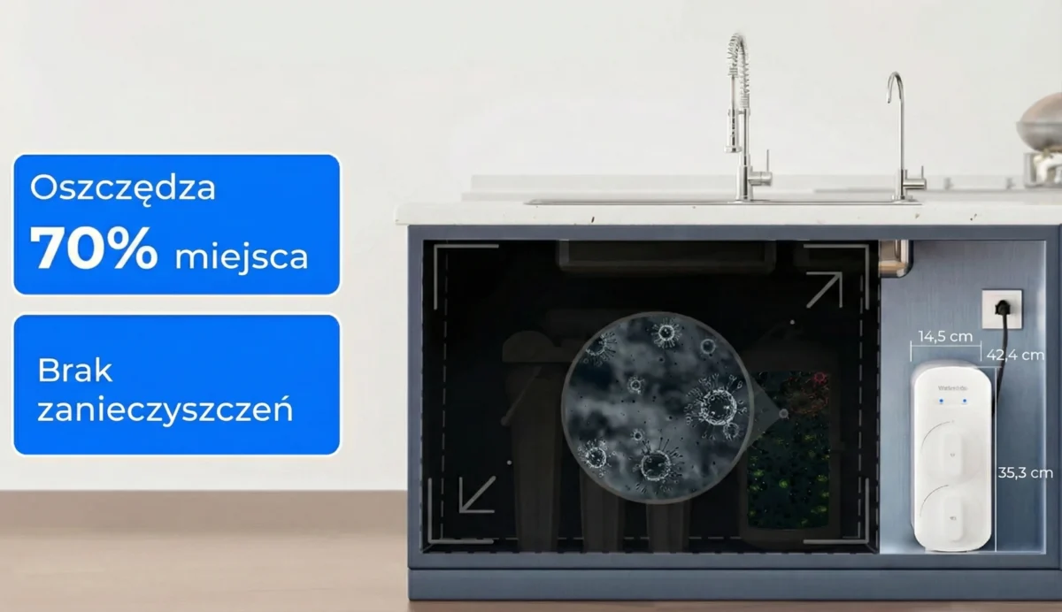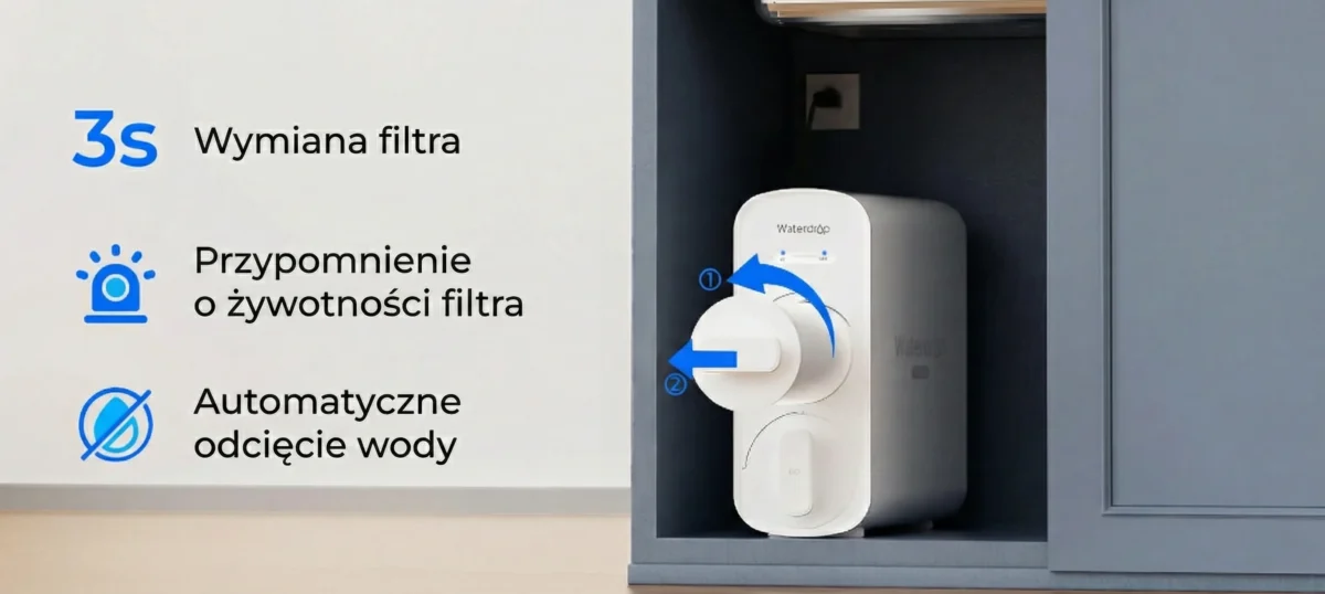 Oceniono 5.00 na 51 799,00 złByło 2 399,00 złOszczędź 600,00 złWaterdrop G3P600 to filtr wody z odwróconą osmozą (RO) przeznaczony do montażu pod zlewem w konstrukcji bezzbiornikowej. System oczyszcza wodę w chwili poboru i podaje ją bezpośrednio z instalacji domowej, zapewniając stały dostęp do filtrowanej wody bez magazynowania i bez spadków wydajności.