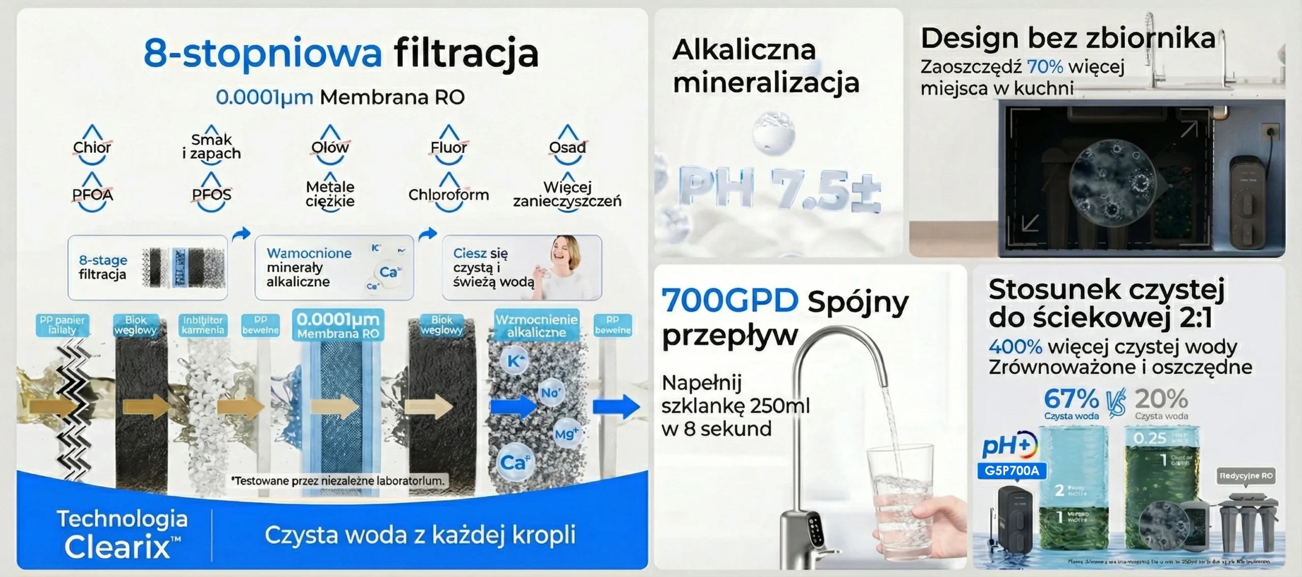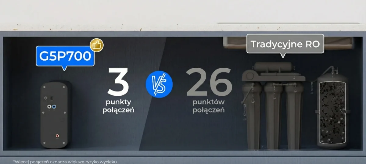 | Żywotność filtra | G5P700A-CF – 6 miesięcy, G5P700A-RO – 24 miesiące |