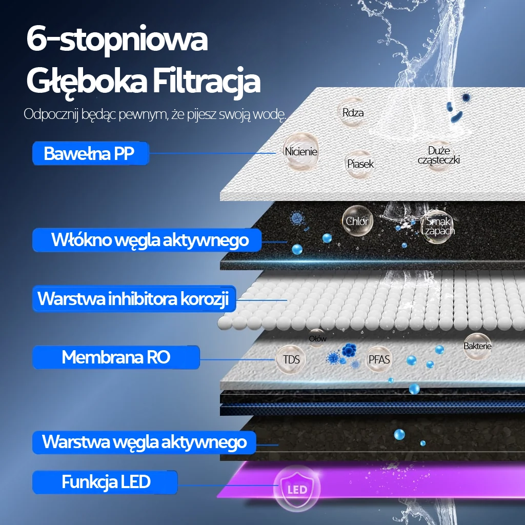 6-etapowy system filtracji wykorzystuje membranę odwróconej osmozy o dokładności 0,0001 μm, redukując całkowitą ilość rozpuszczonych substancji stałych (TDS) oraz wybrane zanieczyszczenia, w tym metale ciężkie i chlor. Filtracja odbywa się przepływowo — bez zbiornika ciśnieniowego i bez ingerencji w instalację kuchenną, zapewniając stały dostęp do oczyszczonej wody.