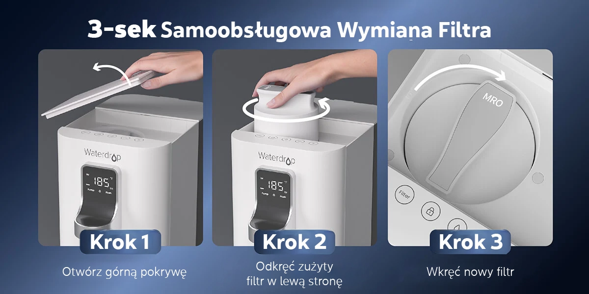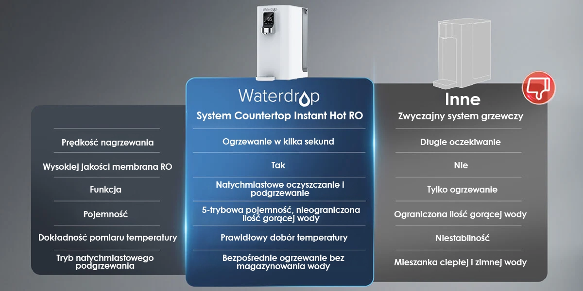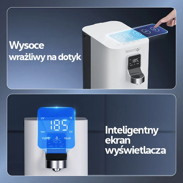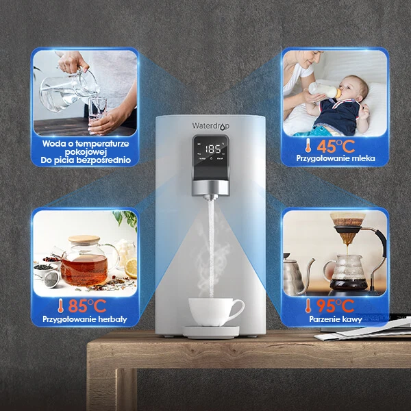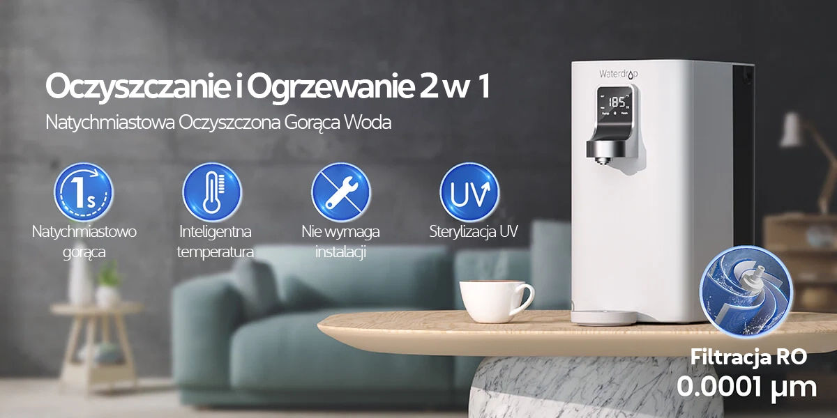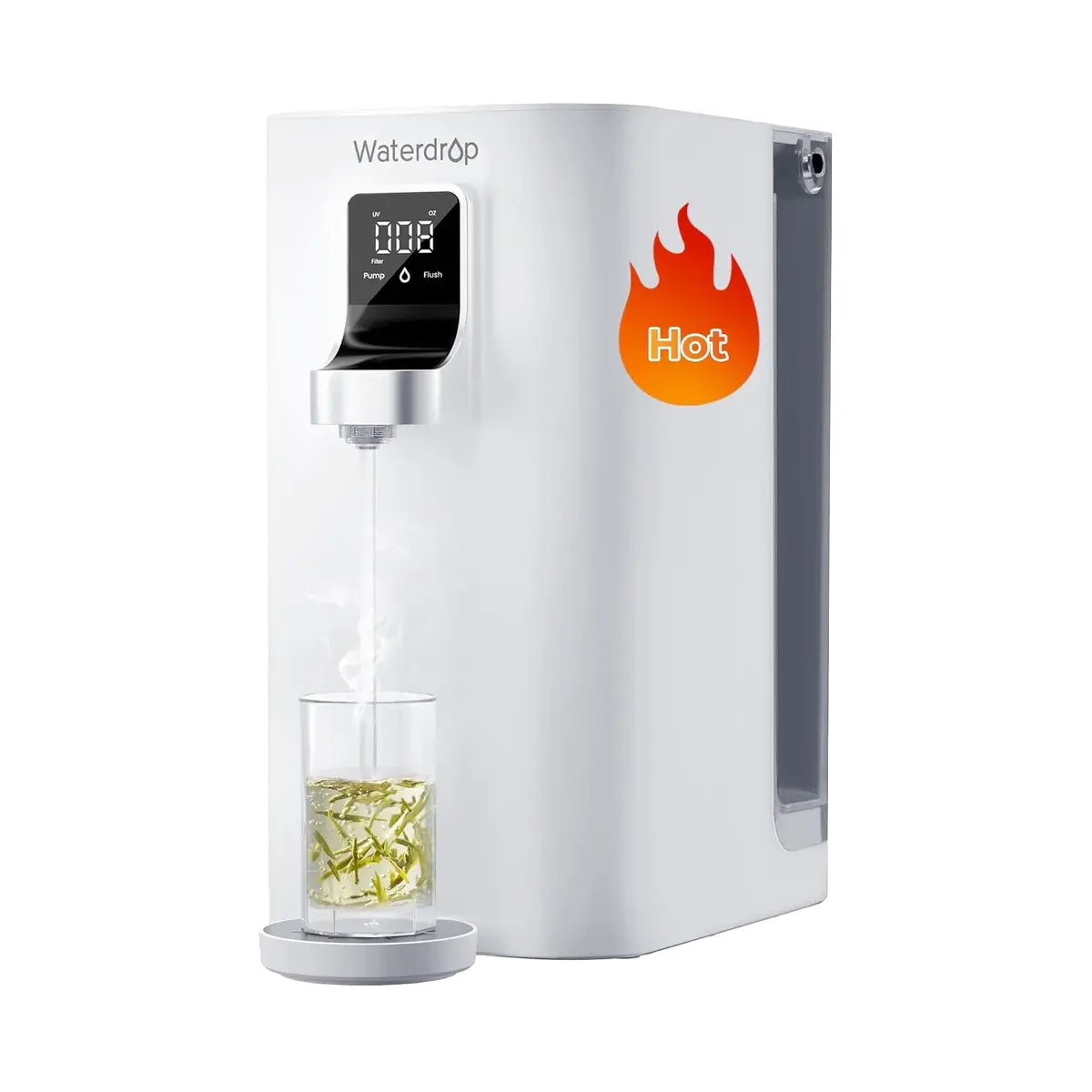 Waterdrop K19-H to nablatowy filtr wody z odwróconą osmozą (RO) i funkcją podgrzewania, który oczyszcza wodę w chwili poboru i podaje ją w ustawianych temperaturach. Zintegrowana lampa UV wspiera higienę przepływu na etapie dozowania. Nie wymaga montażu pod zlewem ani doprowadzenia wody — wystarczy powierzchnia robocza i dostęp do zasilania.