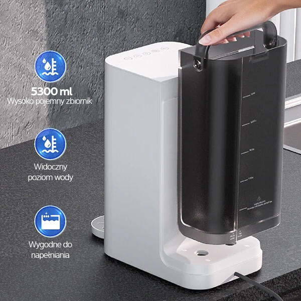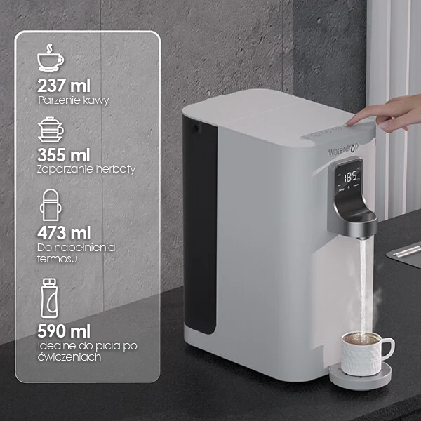 Urządzenie podaje wodę podgrzaną do ok. 95°C oraz umożliwia wybór objętości dozowania. Rozwiązanie upraszcza przygotowanie kawy, herbaty i napojów instant bez użycia czajnika.