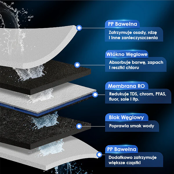 Filtr 5 w 1 składa się z membrany RO, bloku węglowego, włókna polipropylenowego (PP) oraz innych substancji filtrujących. Skutecznie redukuje TDS, chrom, PFAS, fluor, arsen, sól, metale ciężkie, azotany, cząstki, chlorki i inne szkodliwe substancje dzięki precyzyjnemu filtrowaniu warstwa po warstwie, osiągając głębokie oczyszczenie i zapewniając, że każda kropla to czysta woda.