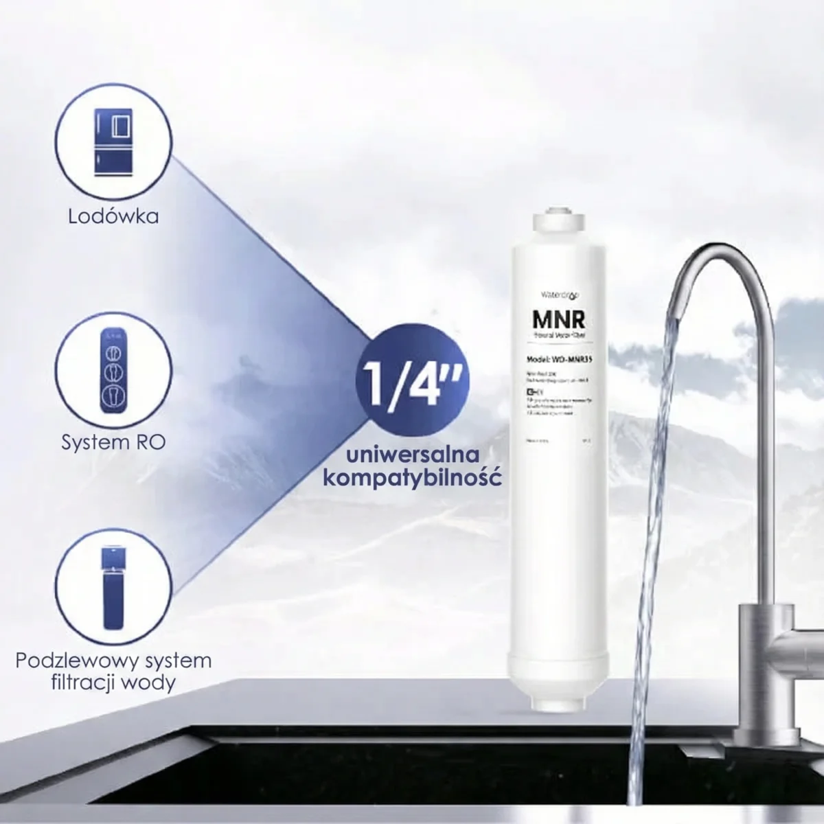 Ten filtr remineralizujący, działający jako niezależny filtr wody, jest kompatybilny z rurkami 1/4” typu quick connect. Może być podłączony do większości systemów odwróconej osmozy dostępnych na rynku lub podblatowych systemów filtracji wody, pozwalając cieszyć się „wodą źródlaną” prosto z kranu.