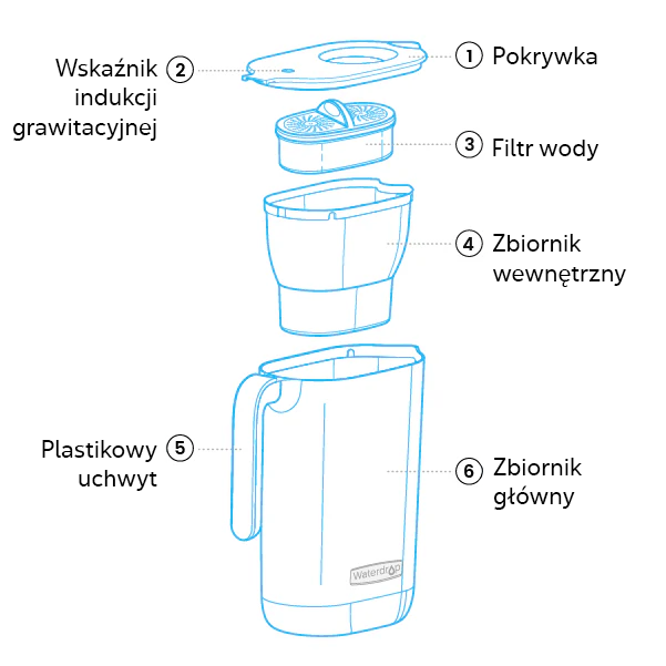 Dzbanek działa w pełni grawitacyjnie — wystarczy napełnić górny zbiornik, aby po krótkiej chwili uzyskać wodę gotową do picia.