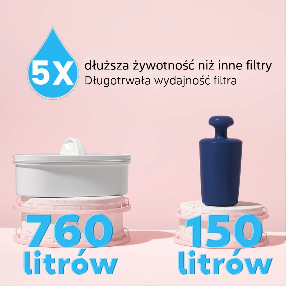 Waterdrop zapewnia wielostopniowy filtr, który umożliwia szybszy przepływ wody i ma 5X dłuższą żywotność. Innowacyjna technologia wielostopniowej filtracji pozwala dzbankowi skutecznie filtrować szkodliwe substancje, takie jak chlor, smak i zapach, kamień, metale ciężkie i zachować korzystne substancje.