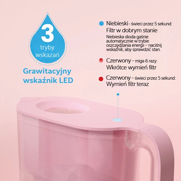 Ten dzbanek oczyszczający wodę Waterdrop ma wskaźnik żywotności filtra grawitacyjnego, który jest wygodnym, widocznym przypomnieniem o czasie wymiany filtra. Świecące NIEBIESKIE światło oznacza, że filtr działa prawidłowo. Gdy zmieni kolor na CZERWONY i zacznie migać, musisz przygotować się do wymiany filtra. Jeśli światło pozostanie na CZERWONYM przez 5 sekund, nadszedł czas na szybką wymianę filtra.