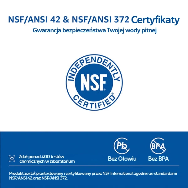 Filtr posiada certyfikat NSF 372 potwierdzający brak zawartości ołowiu.