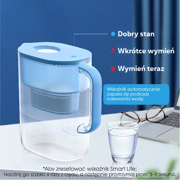 Zintegrowany wskaźnik przypomina o konieczności wymiany wkładu poprzez zmianę koloru diody, eliminując potrzebę ręcznego liczenia czasu użytkowania.