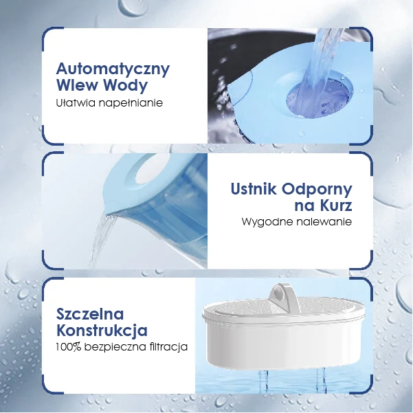 Dzbanek działa w pełni grawitacyjnie — wystarczy napełnić górny zbiornik, aby po krótkiej chwili uzyskać wodę gotową do picia. Obsługa pozostaje intuicyjna i nie wymaga podłączeń.