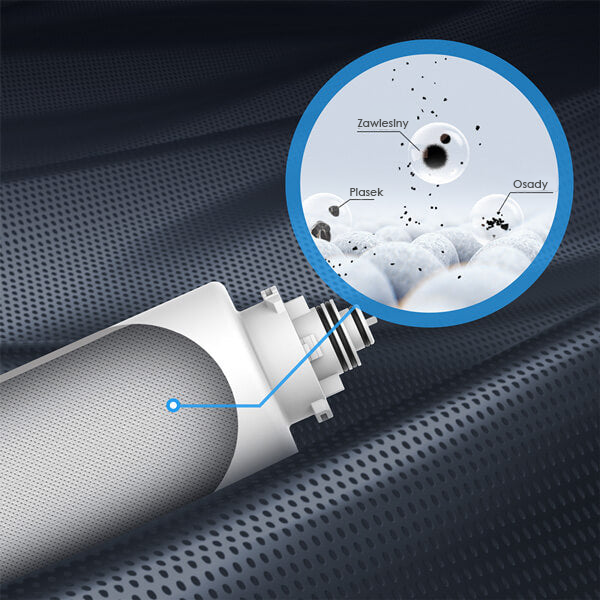 Filtr wykorzystuje włókno polipropylenowe (PP), które pomaga zatrzymywać piasek, rdzę, muł oraz inne widoczne zawiesiny obecne w wodzie. Wstępne oczyszczanie wspiera skuteczność kolejnych wkładów filtracyjnych i może pomagać wydłużyć ich żywotność.