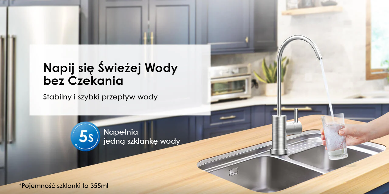 Konstrukcja przepływowa zapewnia bieżący dostęp do filtrowanej wody podczas nalewania. Brak zbiornika eliminuje potrzebę magazynowania i skraca czas oczekiwania na wodę.